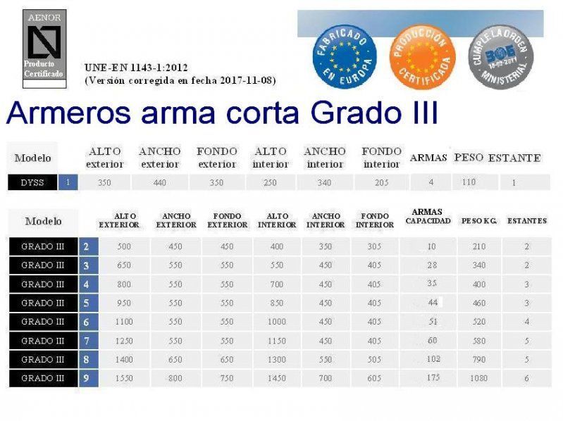 Los armeros/cajas fuertes deben contar con la autorización de la Intervención Central de Armas de la Dirección General de la Guardia Civil. La actual normativa obliga a guardar las armas correctamente. Por eso, los armeros/cajas fuertes deben estar homologados por un laboratorio según la Norma 1143-1 UNE EN Grados I-III-IV (Es una Norma Europea no de la Guardia Civil) y certificación del producto por un ente certificador que el caso de España es AENOR